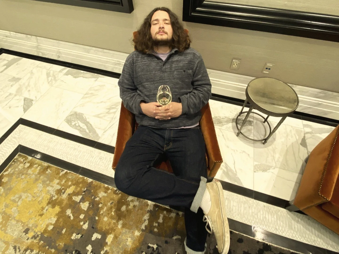 Ethan (me) sitting in a suede chair with glass of an undisclosed white wine.